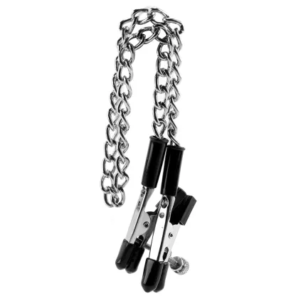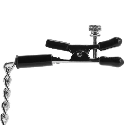 Great for nipples, clitoris and more, the soft rubber-finished tips provide some cushioning while applying completely customizable pressure, simply twist the threaded pins to increase the tension to a perfect fit. A swinging silvery connector chain links the two clamps, offering some extra weight along with something to tug and tease while the clamp portion holds tantalizingly tight.