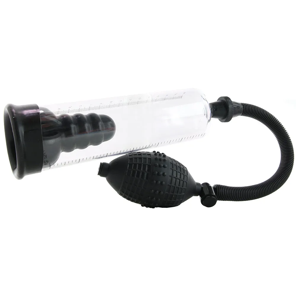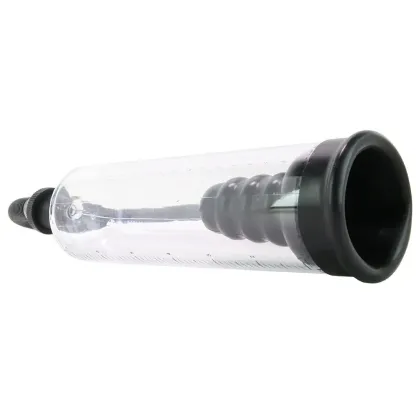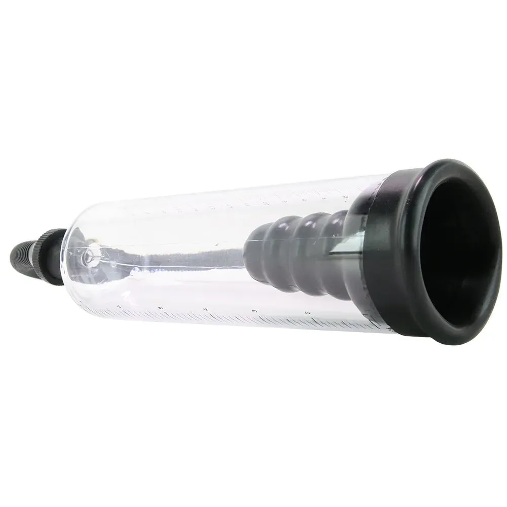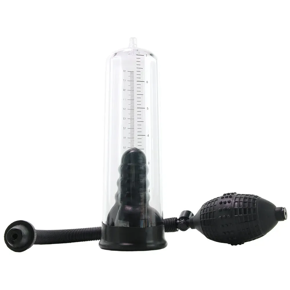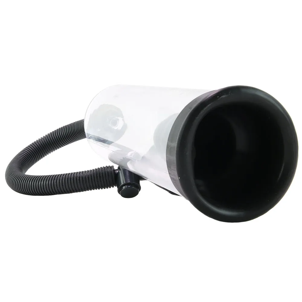 Lube up with a favorite water-based formula and slip into the Rookie's opening. The soft silicone around the entrance reaches down about 2.5 inches in, helping hold your penis in place and also securing an airtight seal. Beforehand, attach the flexible black hose to the top of the clear cylinder so it's ready to go. A few squeezes of the ball valve will activate suction, which it turn draws blood into the penis and builds a rock hard erection.