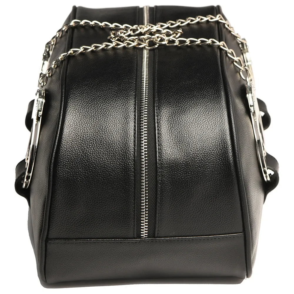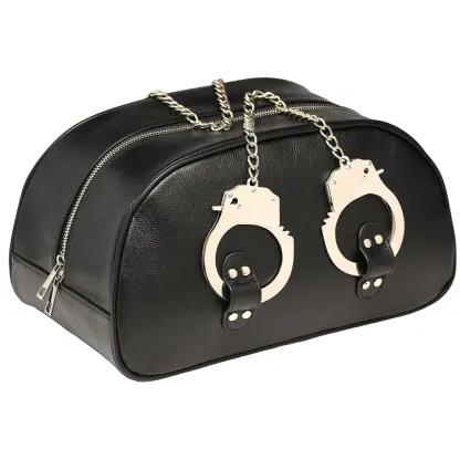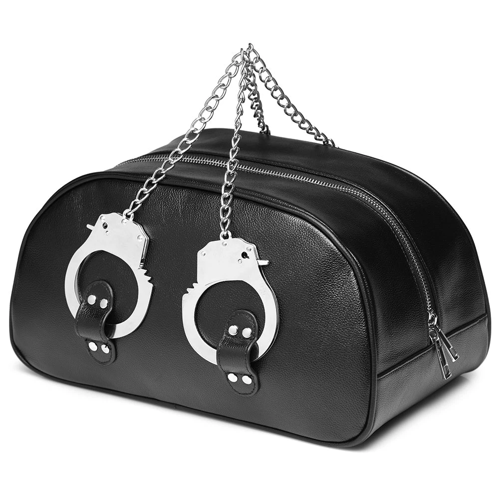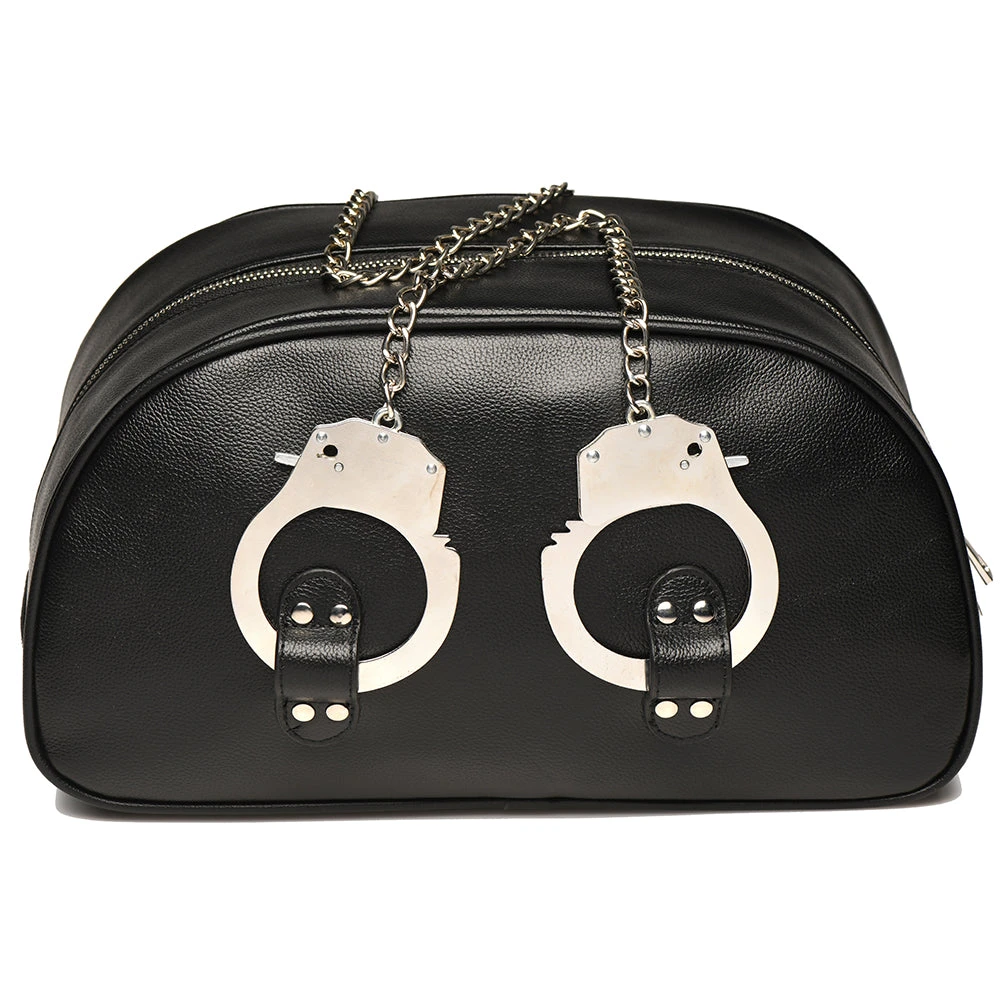 Pack your Bag for the weekend, an overnight stay, or as a (sexy) emergency kit - it holds all your essentials and maybe some non-essentials, too. As for the cuffs - two classic metal sets are included. Clip them to loops on each side of the black vegan leather Bag for instant carrying straps. Four keys are included.