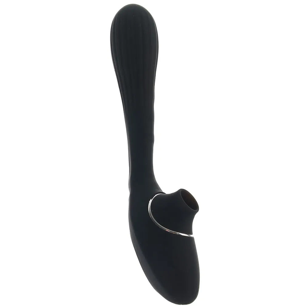 At one end, a curvy, swollen shaft rumbles and throbs in ten possible vibration patterns. Meanwhile, a sweetly sucking clitoral and outer air stimulator waits with ten more options at the opposite end. Straighten out the super-flexible shape to reap the orgasmic benefits of each end independently, or fold it over to take advantage of both at once. Inner vibration and the clit tapping functions are separately controlled with simple buttons, so you can pick and choose what feels best at any given time.