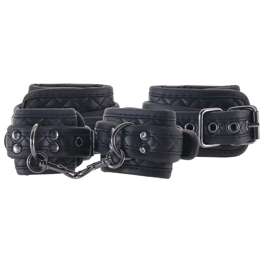 Let's talk about the cuffs first! Lined in soft padded neoprene and designed to fit playful bondage scenarios of all types (not to mention wrists and ankles of just about any size), the two sets of Cuffs combine supple bonded leather styling with sturdy metal hardware. Immobilize a playmate's legs by connecting handy swivel clasps to each Cuff's D-ring (or each other) - they're conveniently compatible with favorite play gear, bondage systems, and beyond.