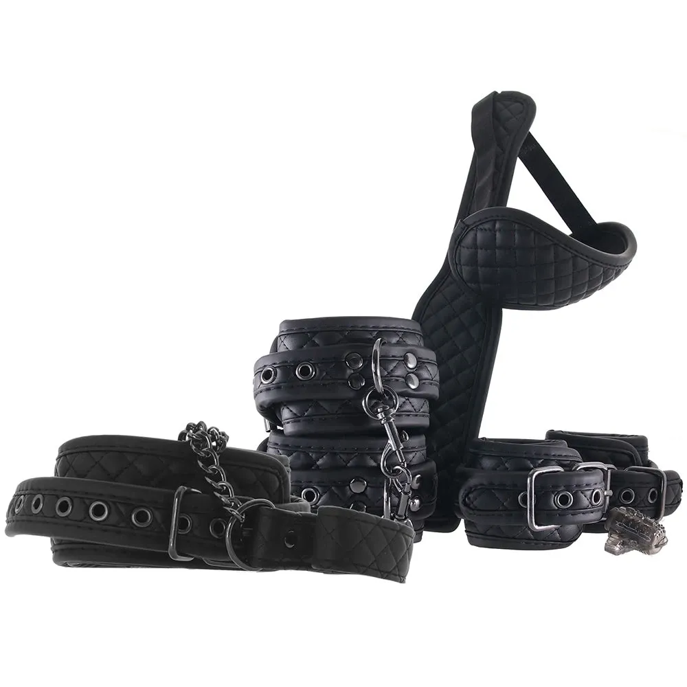 Inside, you'll find six diamond-patterned bdsm mainstays: a classic paddle, a blackout blindfold, two pairs of soft-lined cuffs (one for wrists and one for ankles), and a collar/leash combo.