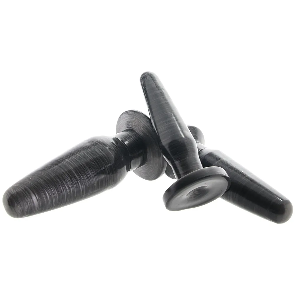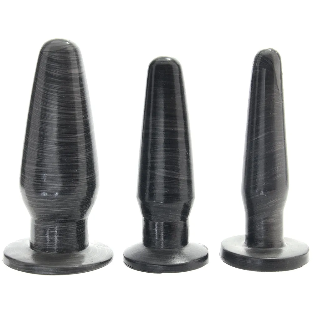 Inside, you'll find three classically tapered plugs in marbled black. They're each shaped for easy insertion, quick adjustments and removal, but the similarities stop there. Thickness-wise, the plugs are very different, all the better to help you a) work up to or b) dive right into butt play bliss.