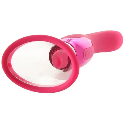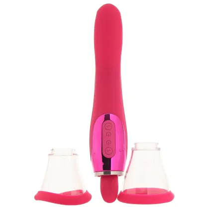 So, to sum up, Apex is not just a clit plumping suction pump, a silky smooth, sweet-spot seeking vibrating penetrator or a toe-curling oral sex simulator, it's all three of those things! When you first un-box your Apex, you'll find four pieces, a luscious pink silicone vibrating shaft with a bright pink tongue at one end and a smooth curve at the other, two silicone-edged suction cups and a teasingly textured tongue-shaped sleeve.
