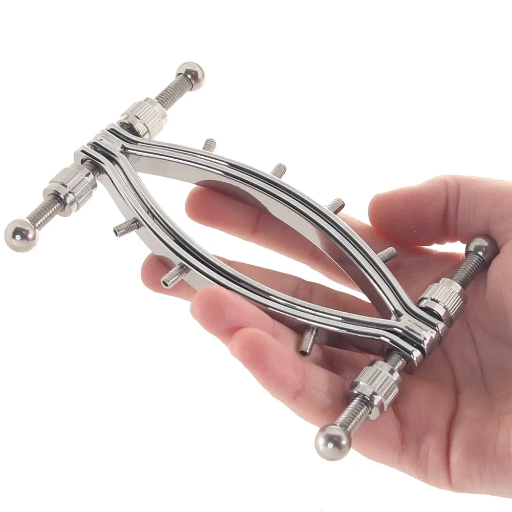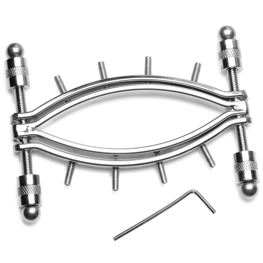 The Pussy Clamp was designed to fit over the outer labia or lips, with an edge tucking away below, and the other, spiky side framing the entire vulva. Once in position, you or they will be able to increase or decrease pressure on the outer edge, pinching or spreading the outer labia.