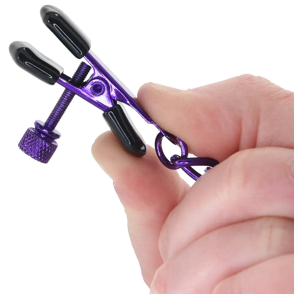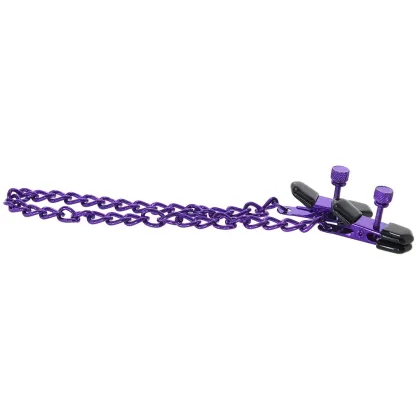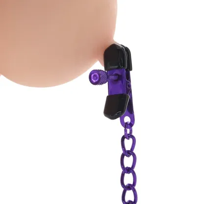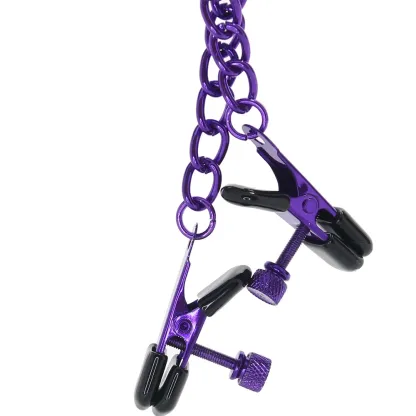 These classic, fully adjustable pinchers capture your or your playmate's nipple flesh from two sides - a little softness cushions the tips. A glossy purple chain connects each clamp - it'll swing and swish as you play, which, in turn, tugs and teases.