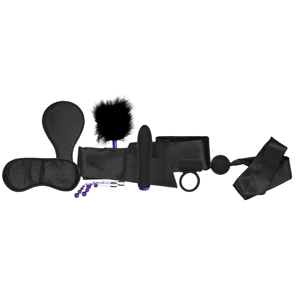 Inside, you and your partner(s) will find eleven spectacular BDSM staples, including some silky satin cuffs, a ten-speed silicone vibe, some pretty, pinch-y nipple clamps, and much more. You can use each piece solo or combined with the others - we obviously recommend trying them all at once!