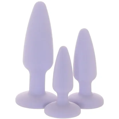 Inside, you'll find three classically tapered, sparkle-based plugs in lilac silicone. They're each shaped for easy insertion, quick adjustments and removal, but the similarities stop there. Thickness-wise, the plugs are very different, all the better to help you a) work up to or b) dive right into butt play bliss. Just a note: even the 'wildest' Mild to Wild Plug is extra manageable, size-wise, so this is truly a great place for newcomers to start.