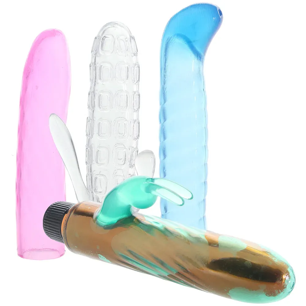 For instance, aside from all the fun you'll get up to using the sleek rose gold multi-speed vibe all on its own, four included colorful jelly sleeves - one nubby, g-spot angled, one rabbit and one rabbit with butt-tickler - can and will add some very exciting sensations once slipped overtop. Speaking of butts, a sexy little jelly plug is also included.