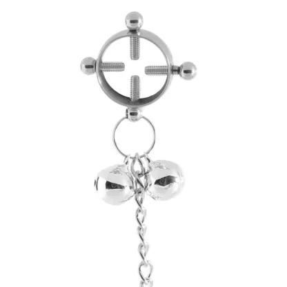 Featuring a unique style that has four press screws capturing your or your playmate's nipple flesh from four sides, the Nipple Grips also feature a pair of jingly little bells at the base of each. A dangly metal chain connects each Press, and adds some sexy swing and teasing tugs to your experience.
