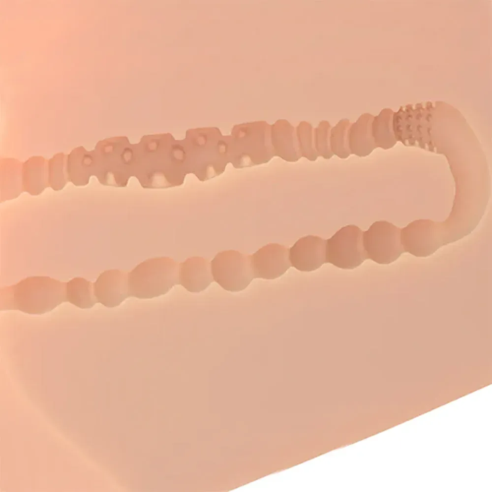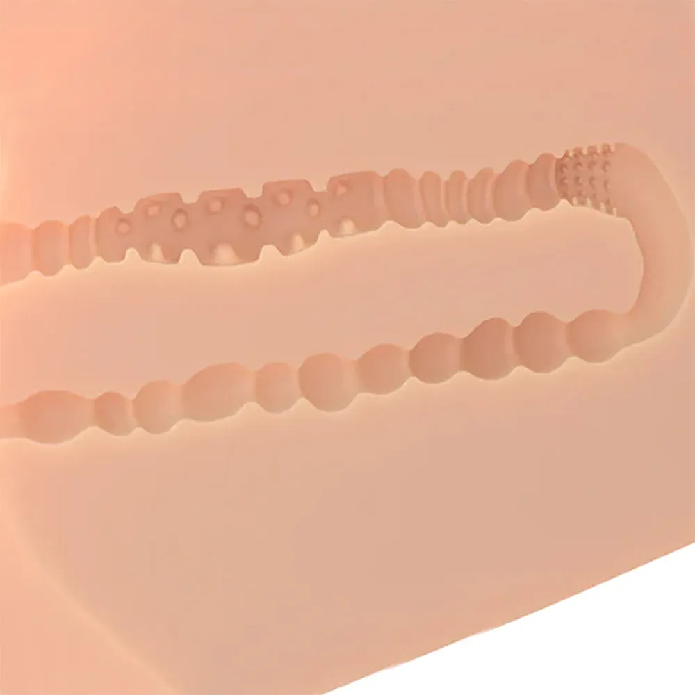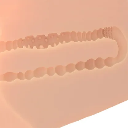 Up top, you've got that massive rack to play with, and below, a tight, soft-lipped pussy and snug, puckered butt between spank-able cheeks. Both the pussy and butt share an internal channel, which splits off into two massively stimulating textures. The closed-off design naturally creates suction as you thrust, plus, it contains the aftermath. No muss, no fuss!