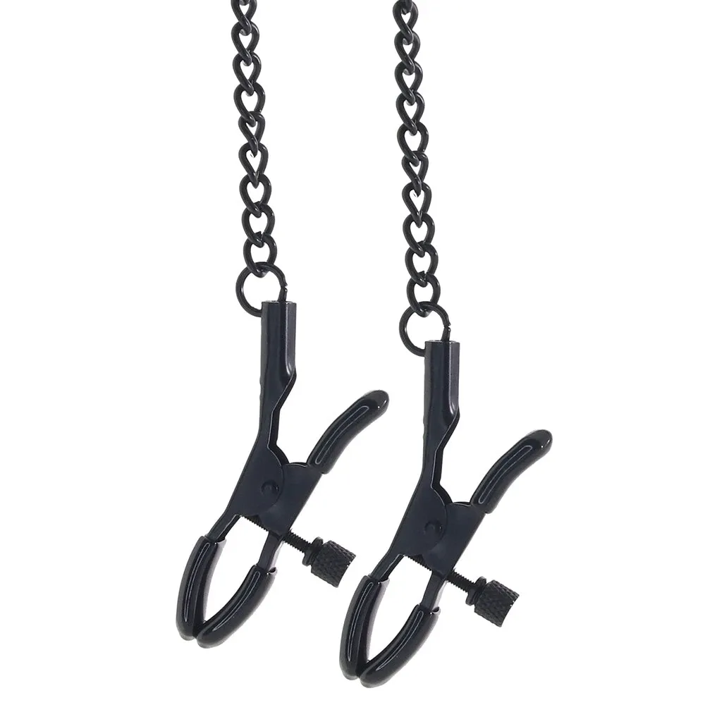 If some pinch would be welcome, clip on the black metal nipple clamps. You can attach the adjustable alligator-style clamps to the sturdy D rings on either side of the gag or use them solo. If you DO decide to wear them together, the clamps will tug and pinch along with movement, another deterrent (or not!) against sexy struggles.