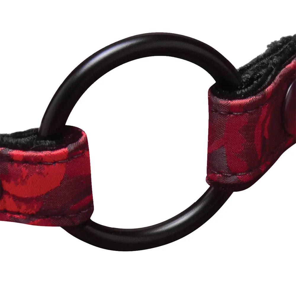 Fitting snugly and securely in their (or your) mouth, a choice of two rings -one in sturdy iron, one in soft silicone - keeps their lips apart, tongue in check, and teeth at a distance. Buckle the rose-patterned vegan leather band around their head after positioning the ring in their mouth or have them do the same.