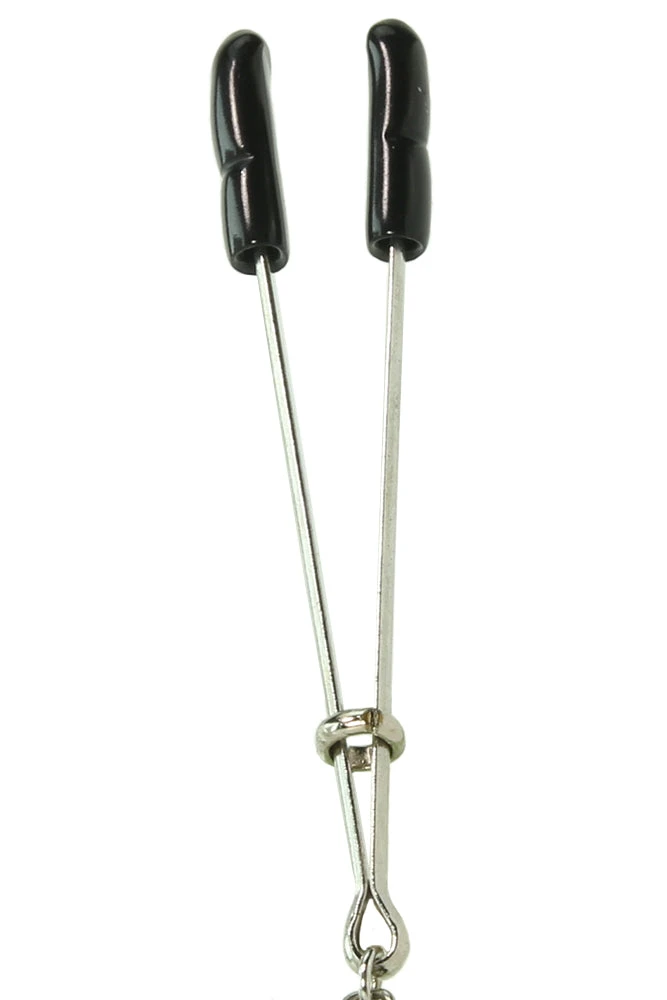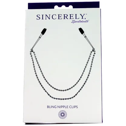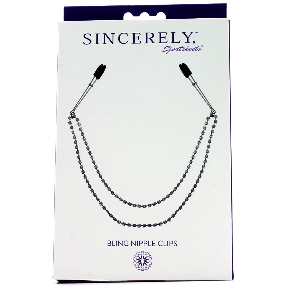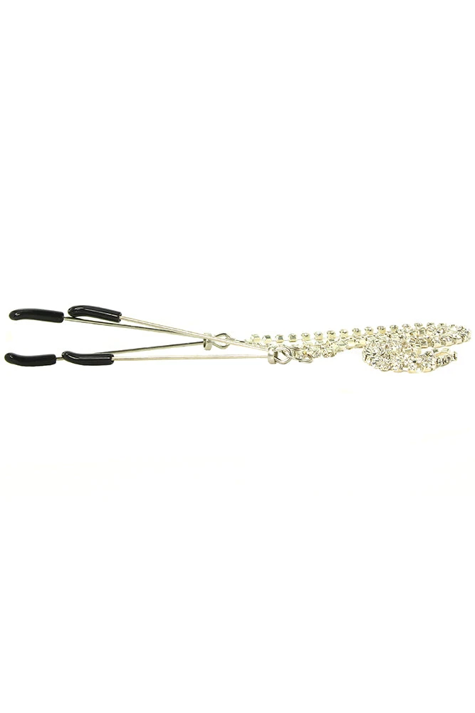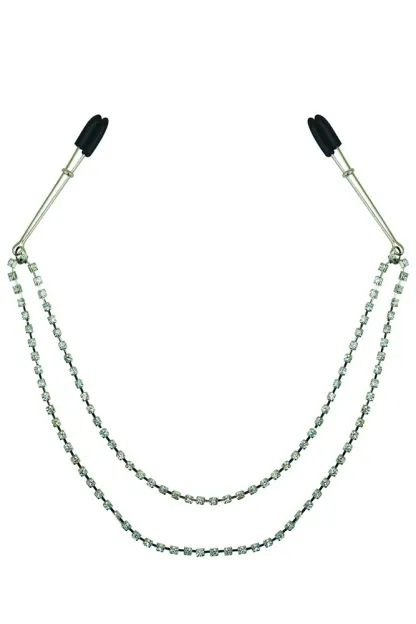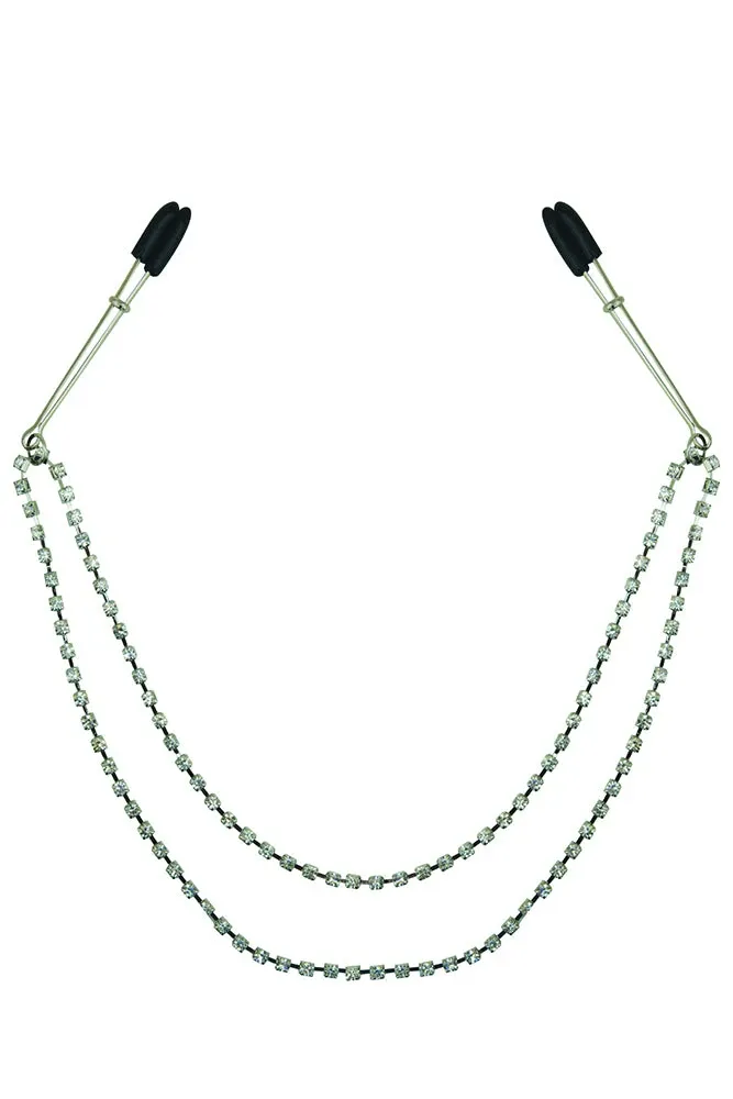 A luxurious crystal embellished set, the gorgeous double chained Crystal Clamps command attention while effortlessly dazzling a mate. Slipping easily over the peaks of the nipples, soft grips cinch grips gently to secure glittery square crystals across the chest. Easy to adjust, the cinch tightens and loosens by sliding a silvery bead up or down. Nickel free.
