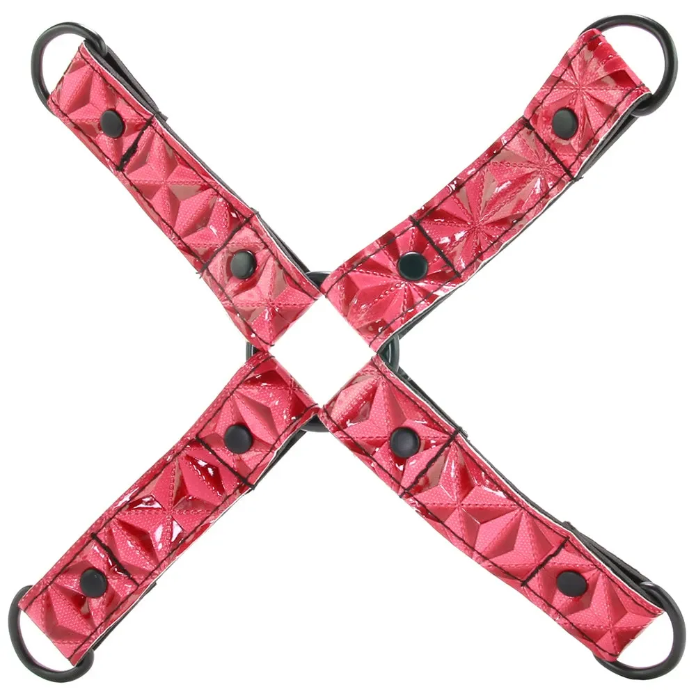 In sexy black patterned vinyl, a classic hogtie is up first. The simple criss-cross straps easily hold a partner's arms and legs together behind the back or in front of the body with the help of 2 included sets of cuffs. Sized to fit both wrists and ankles, the matching vinyl cuffs feature soft padded lining and quick, easily adjustable buckle closures. Clip 'em to the Hogtie, each other or other compatible bondage gear using sturdy swivel clasps. Rounding off the Kit is a shapely Hide and Seek Mask. A soft and stretchy elastic strap holds tight around the back of the head, securing the padded mask over the eyes.