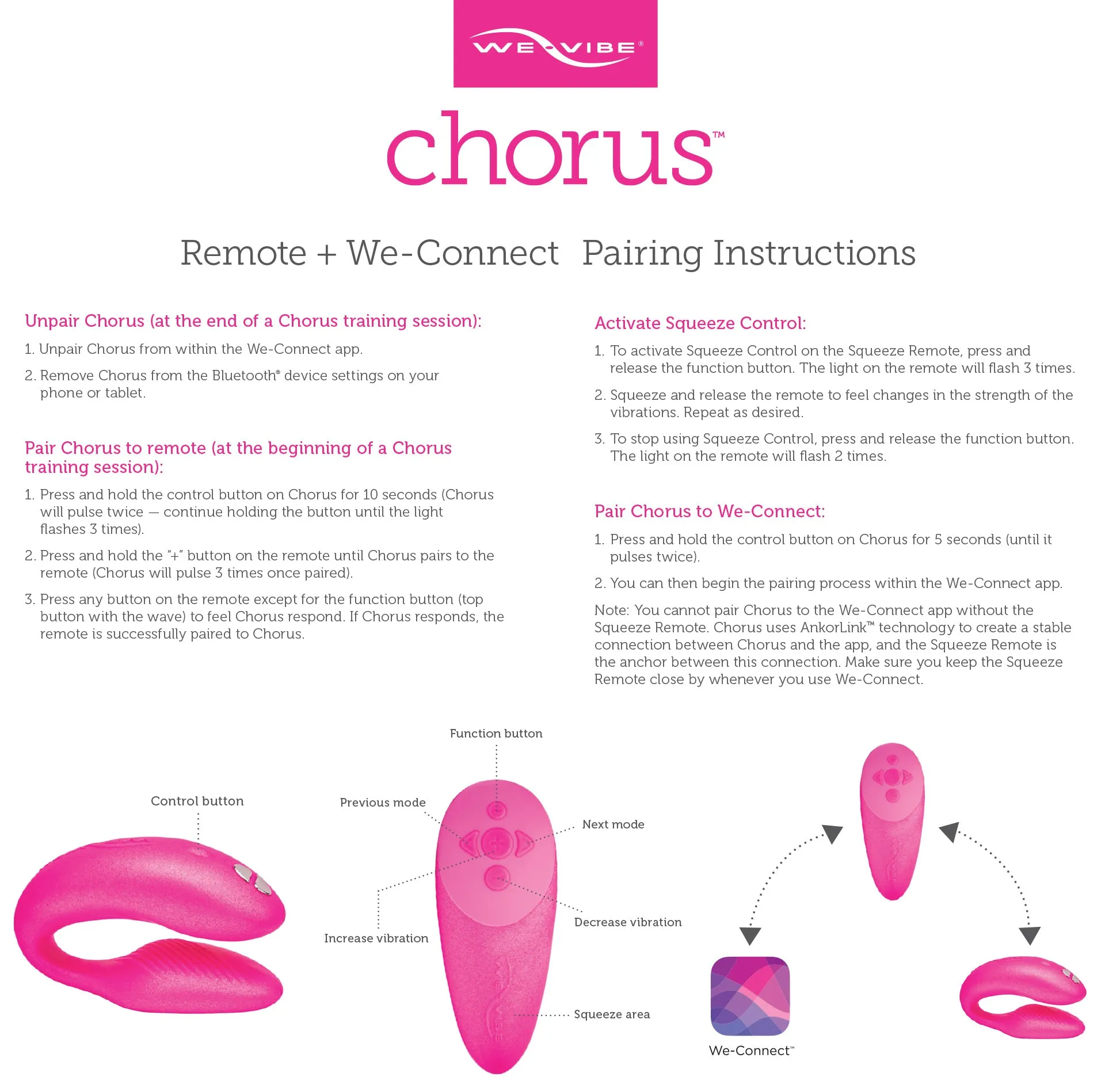 Speaking of We-Connect, the Chorus is the first We-Vibe model to feature Ankorlink. Ankorlink creates the most stable connection possible between you and your partner when playing over Bluetooth. The Squeeze Remote acts as an anchor between your Chorus and the We-Connect app, so the partner with the Chorus will need to keep it close when using We-Connect..