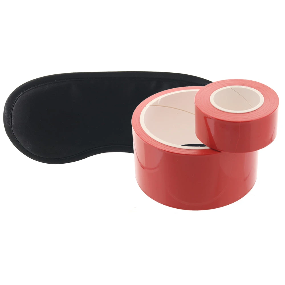 As we mentioned, the shiny Tape sticks only to itself, so you won't have to worry about pulling it off painfully; plus, you can re-use it over and over. To give you a few ideas, Bondage Tape can bind up wrists and ankles, be fashioned into a hogtie, be used as a body wrap, or looped around your bedposts. A classic black silky blindfold is included - do with it as you will!