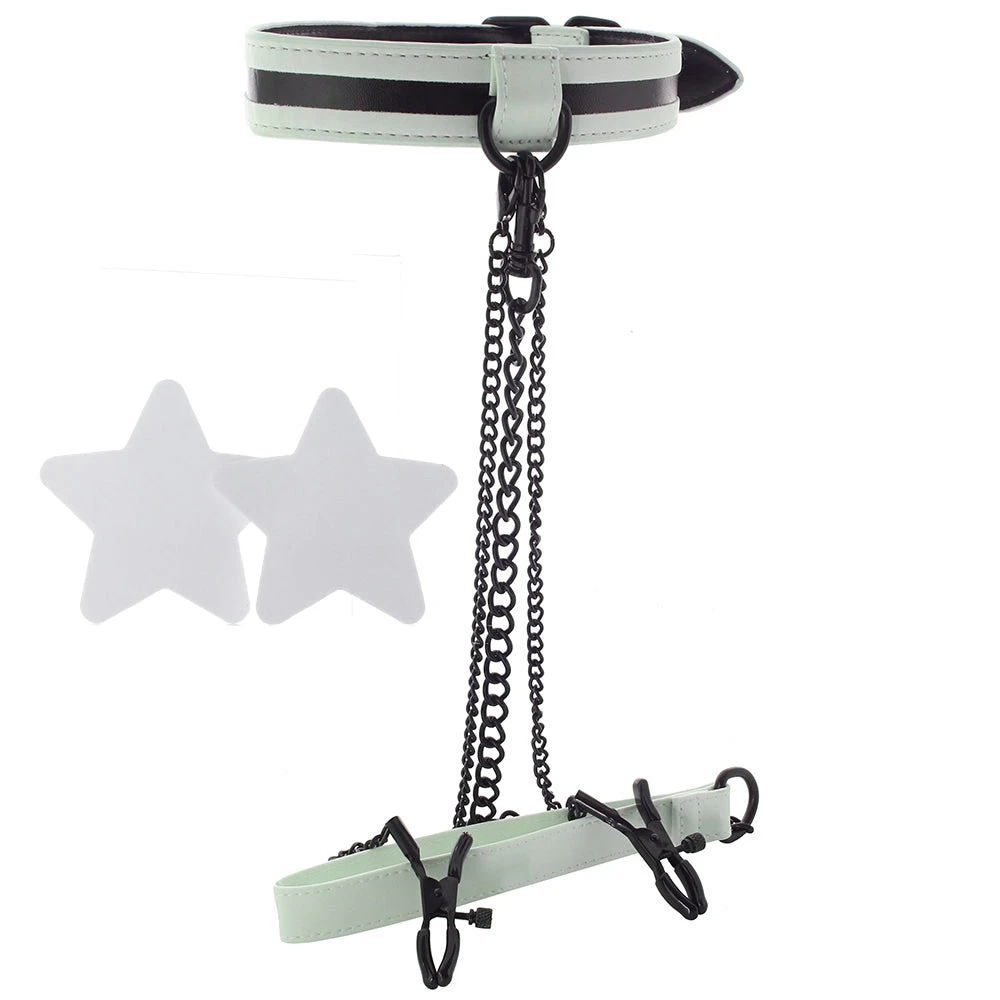 For maximum glow, let the Set's toys and tools soak up some light beforehand. The collar, cuffs, and harness adjust to fit most.