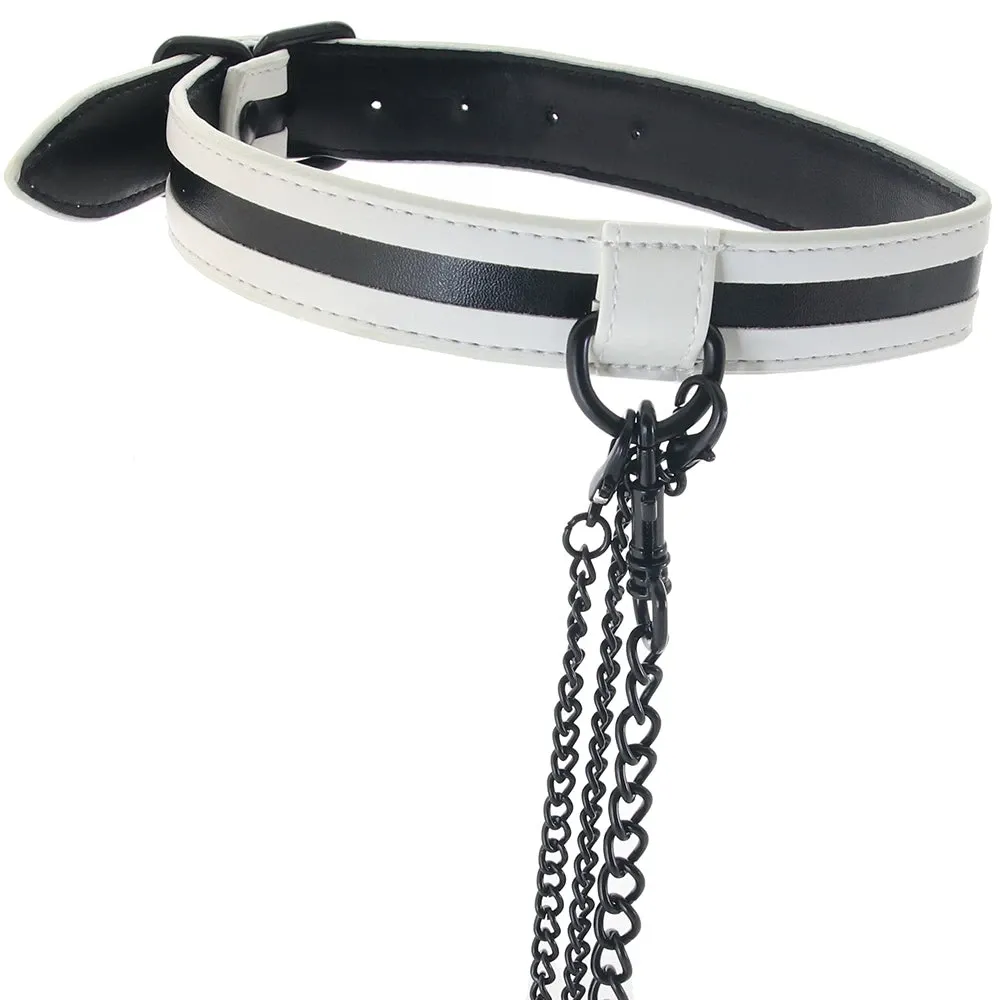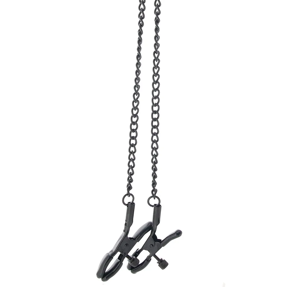 Inside, you'll find an adjustable padded collar, a nice long chain leash, and two chained clamps with variable tension. Wrap the collar around your/their throat, clip on the leash, and position the (rubber-tipped) metal alligator clamps for maximum pinch - or play with either/or solo. Your scene, your gear!