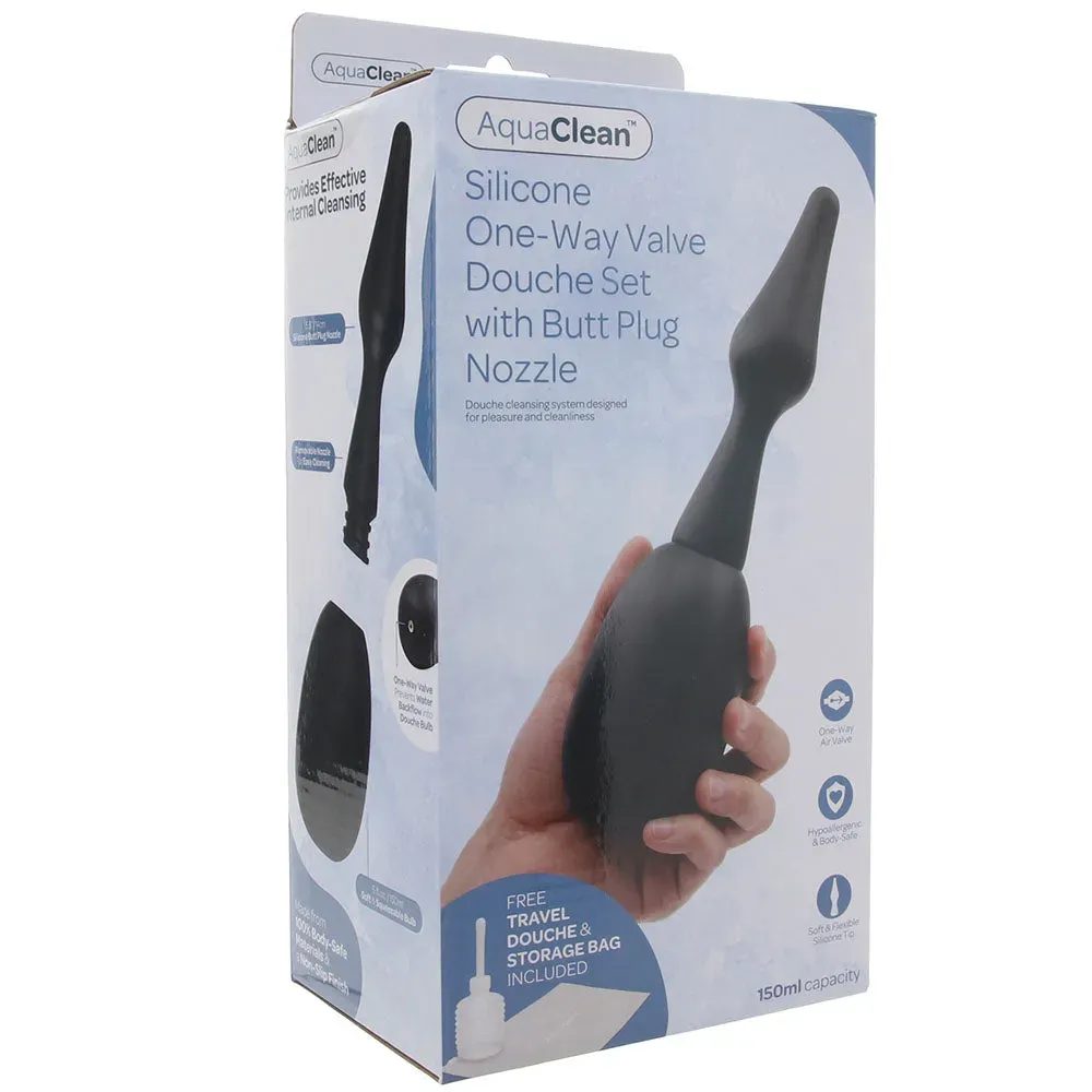 Like to feel a little cleaner than usual before getting in some butt play? Want your sanitation session to be quick and hassle-free? Sure you do! AquaClean's Silicone Douche Set with Butt Plug Nozzle is ready to rock anytime/anywhere, AND its one-way valve banishes messy backflow.