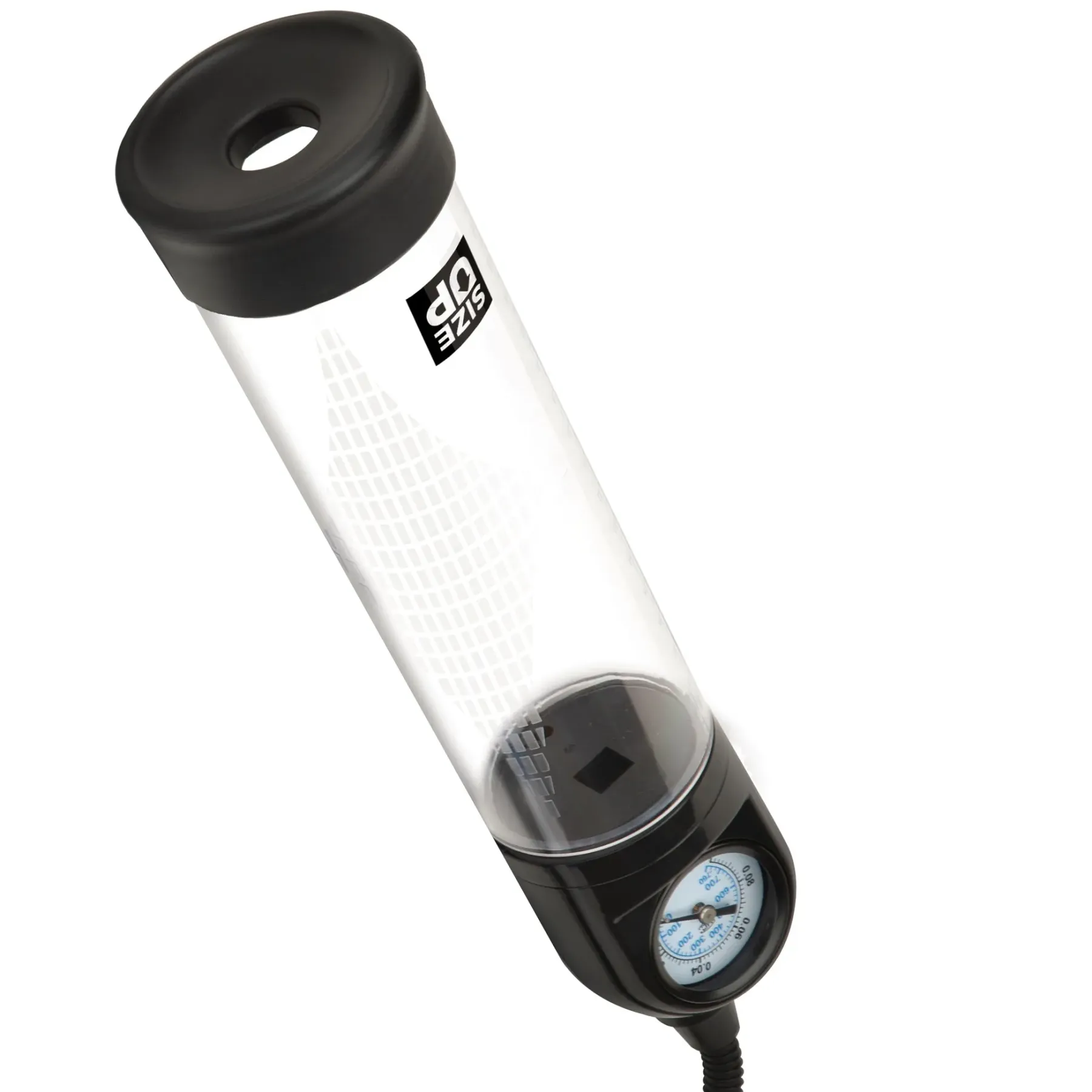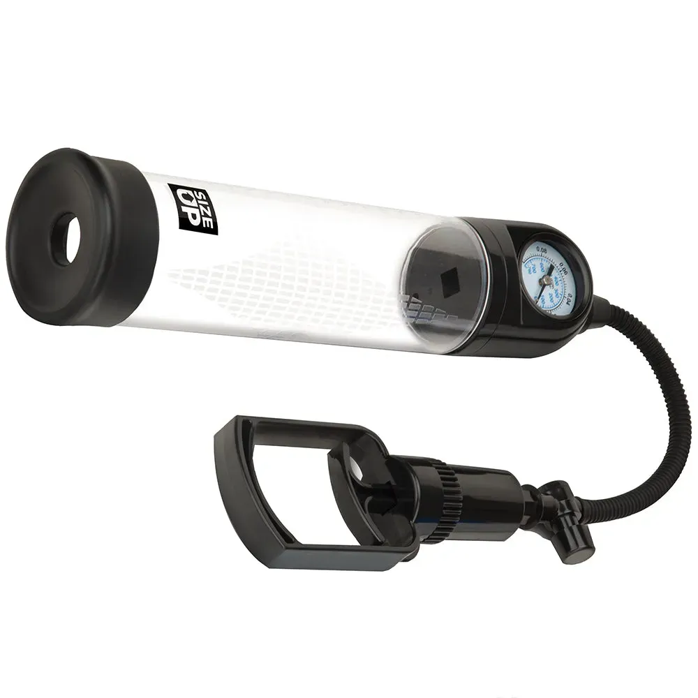 In sturdy acrylic (cylinder) and silicone (donut), the Size Up Pressure Gauge Penis Pump is body safe and extra easy to clean and care for. Wash each piece well before and after pumping with warm soapy water or a good toy care fluid/foam. Compatible with any favorite water based lube.