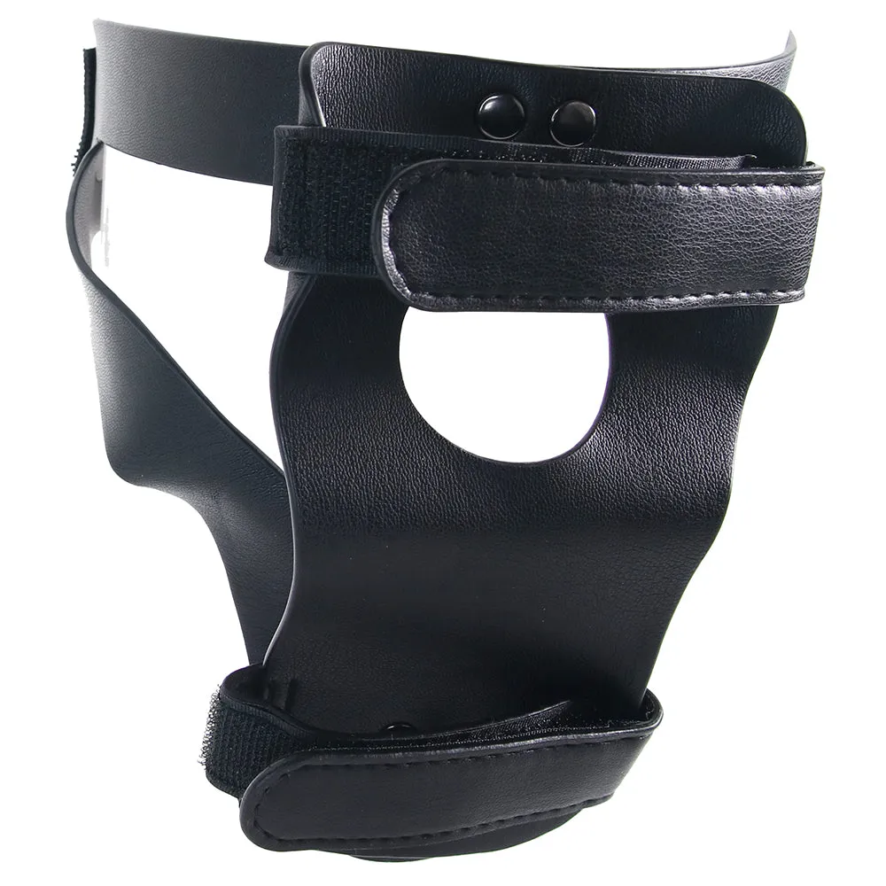 Here's how it works: you'll strap the wide band around your thigh, then strap it in your Wand. All the straps are adjustable, so it'll fit just about any thigh and just about any vibe. When it's in position, facing toward your chosen sweet spot(s), there will be an opening on top of your thigh. If you're playing with someone else, you can slip a wide-based dildo or probe through the built-in 1.57"/4cm O-ring for some super-pleasurable grinding purposes.